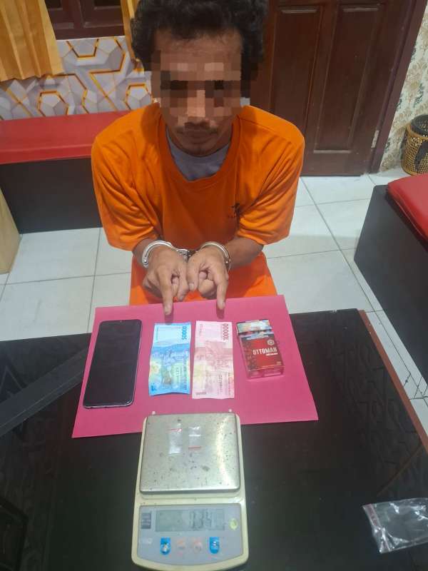 Dari hasil penggeledahan, petugas menemukan dua bungkus plastik bening berisi narkotika jenis sabu dengan berat kotor 0,33 gram yang disimpan di dalam kotak rokok merek Otoman. Selain itu, turut diamankan barang bukti lainnya berupa satu unit handphone Vivo Y125 warna biru, satu unit sepeda motor Honda Astrea Grand, sehelai celana, serta uang tunai Rp150.000.