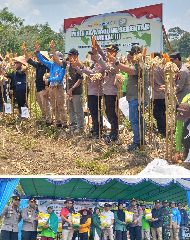 Polres Melawi bersama pemerintah Daerah (Pemda) Melawi, TNI, dan kelompok tani melaksanakan panen Raya Jagung serentak Kuartal – lll Tahun 2025 dalam rangka mendukung Swa sembada pangan di Desa tanjung tengang, Kecamatan Nanga pinoh, Kabupaten Melawi.sabtu 27/09/2025.