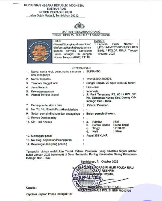 Indragiri Hilir Riau|| ayoonews- 7 Oktober 2025. Penyidik Polres Indragiri Hilir secara resmi telah menerbitkan Daftar Pencarian Orang (DPO) terhadap seorang tersangka bernama Supianto, yang diduga terlibat dalam kasus tindak pidana penipuan jual beli lahan milik masyarakat di Desa Semambu Kuning, Kecamatan Gaung, Kabupaten Indragiri Hilir.