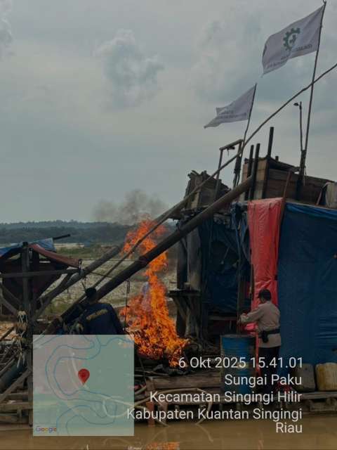 “Menindaklanjuti laporan masyarakat, personel Polsek Singingi Hilir segera turun ke lokasi untuk melakukan pengecekan dan penertiban. Setibanya di lokasi, ditemukan dua unit rakit yang digunakan untuk aktivitas PETI dalam keadaan tidak beroperasi, serta dua buah bendera berwarna putih bertuliskan ‘Utamakan Keselamatan dan Kesehatan Kerja’. Petugas kemudian melakukan pemusnahan terhadap kedua rakit tersebut dengan cara dibakar di lokasi,” jelas Kapolsek.